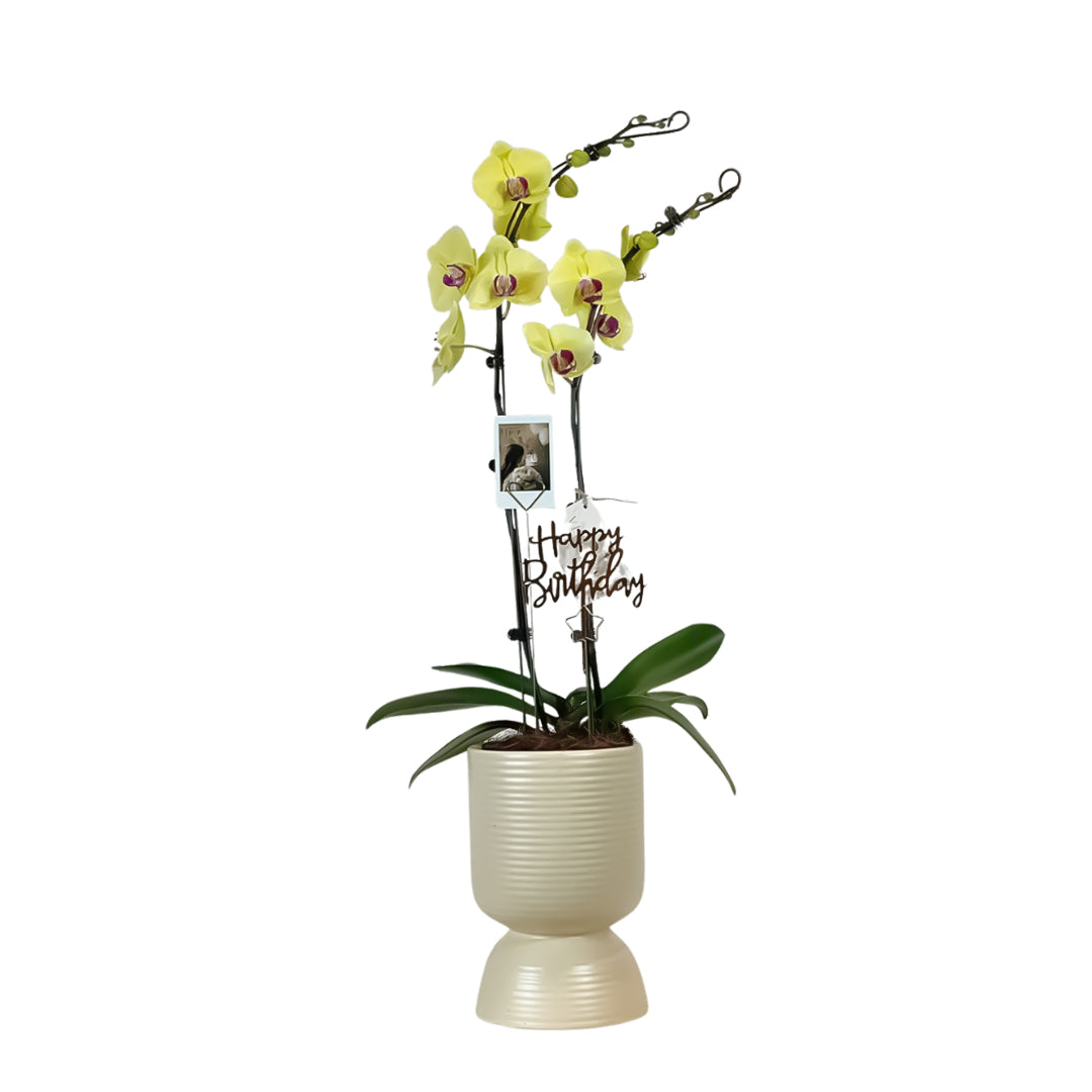 2-stem large arrangement in ceramic vase with Bday topper and Polaroid photo